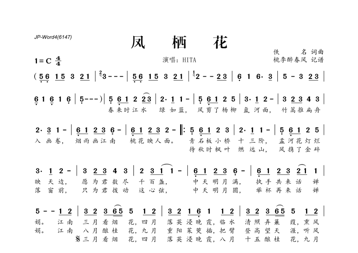《凤栖花》是HITA演唱的一首歌曲,拍号为4/4拍,这份简谱共有一张高清图谱,图谱由 @桃李醉春风 编配上传。