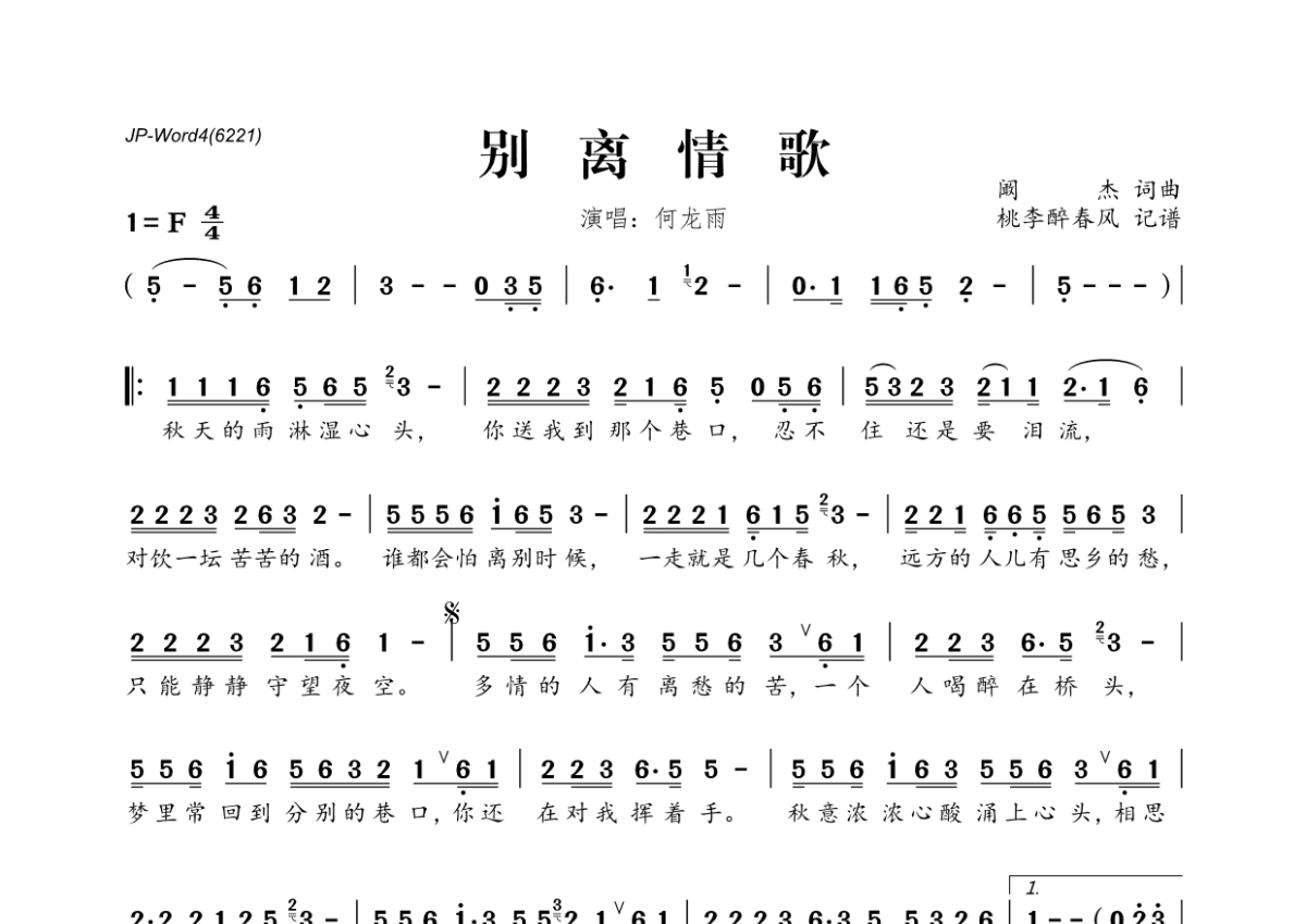 《别离情歌》是何龙雨演唱的一首歌曲,拍号为4/4拍,这份简谱共有一张高清图谱,图谱由 @桃李醉春风 编配上传。