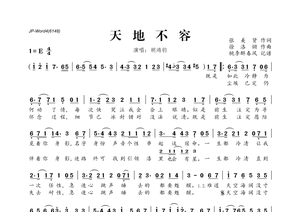 天地不容简谱 - 胡鸿钧演唱