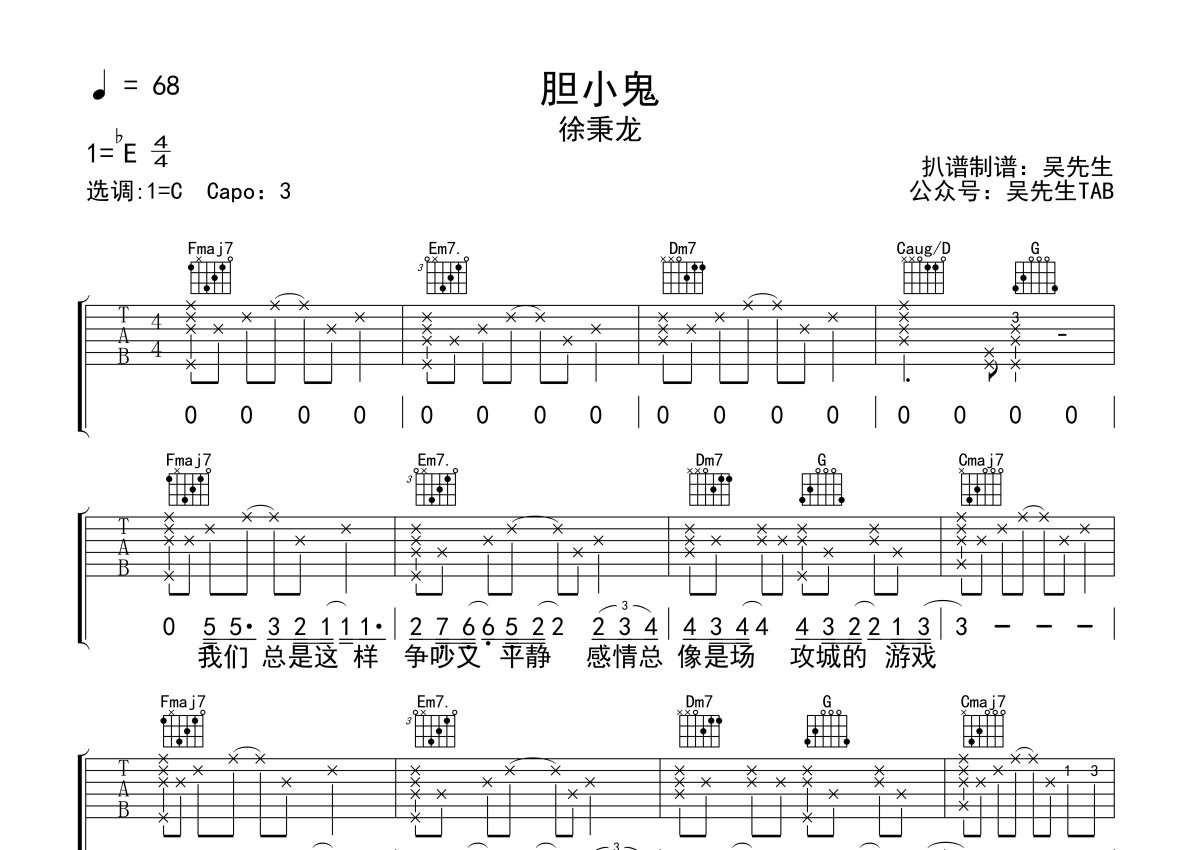 《胆小鬼》是徐秉龙演唱的一首歌曲,本吉他谱采用的是C调指法编配,这份吉他谱共有两张高清图谱,图谱由 @吴先生TAB 编配上传,图谱使用六线谱编配,包含吉他和弦指法、简谱以及歌词部分,使用这份胆小鬼吉他谱,可以让你更加方便地掌握这首歌曲的弹唱技巧,快来尝试吧。原调降E调,变调夹3品。