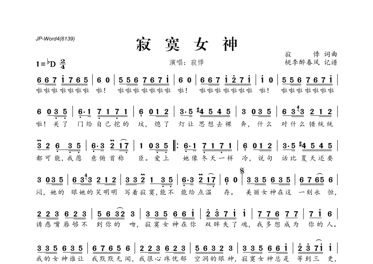《寂寞女神》是寂悸演唱的一首歌曲,拍号为2/4拍,这份简谱共有一张高清图谱,图谱由 @桃李醉春风 编配上传。