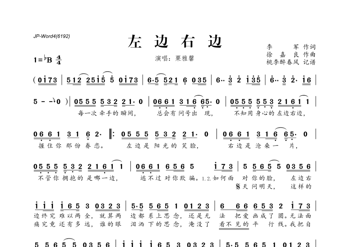 《左边右边》是栗雅馨演唱的一首歌曲,拍号为4/4拍,这份简谱共有一张高清图谱,图谱由 @桃李醉春风 编配上传。