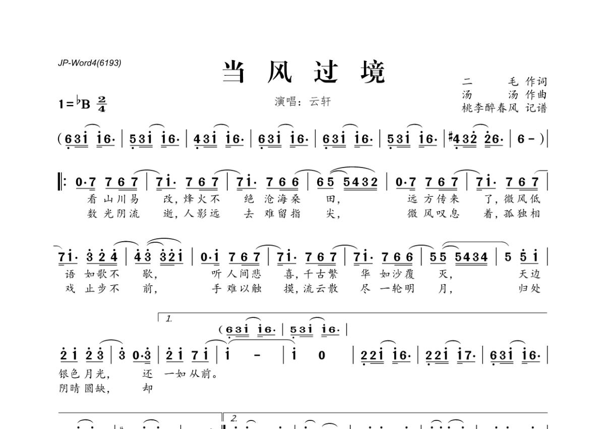 《当风过境》是云轩演唱的一首歌曲,拍号为4/4拍,这份简谱共有两张高清图谱,图谱由 @桃李醉春风 编配上传。