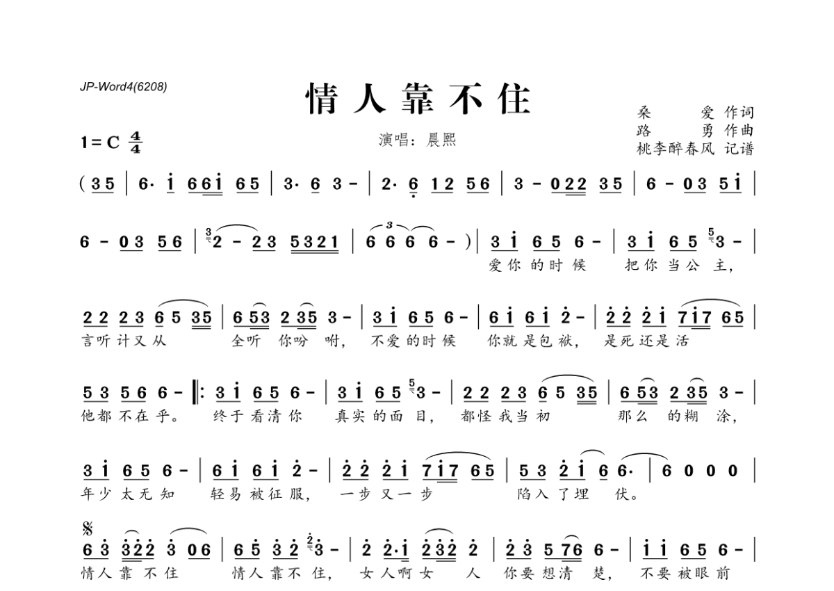 《情人靠不住》是晨熙演唱的一首歌曲,拍号为4/4拍,这份简谱共有一张高清图谱,图谱由 @桃李醉春风 编配上传。