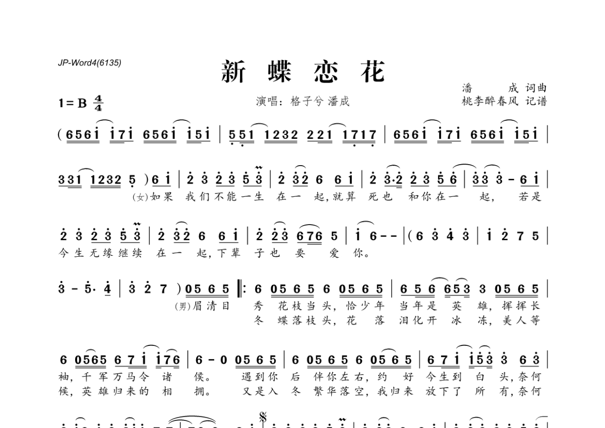 《新蝶恋花》是格子兮&潘成(皮卡潘)演唱的一首歌曲,拍号为4/4拍,这份简谱共有一张高清图谱,图谱由 @桃李醉春风 编配上传。