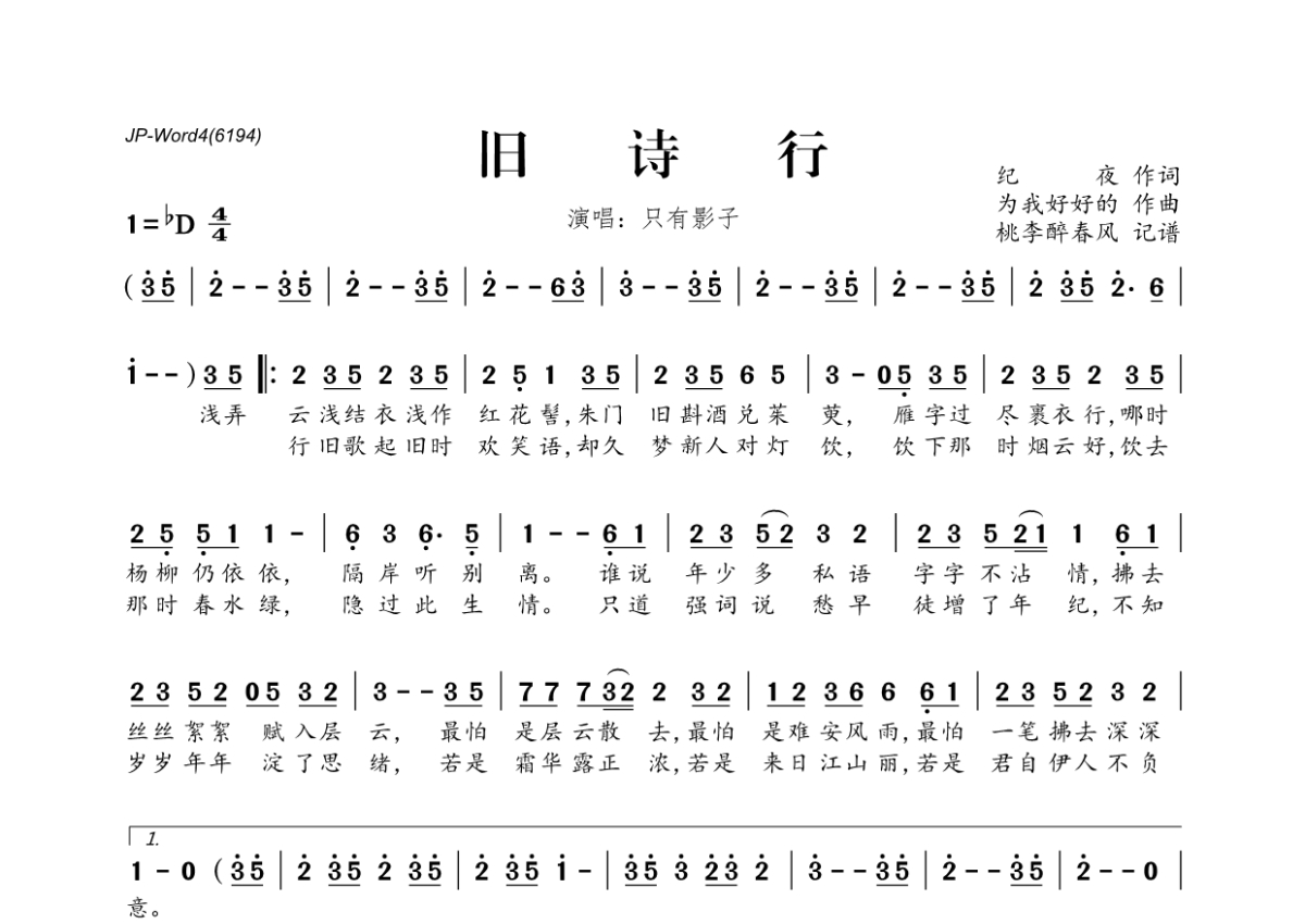 旧诗行简谱 - 陈拾月(只有影子)演唱