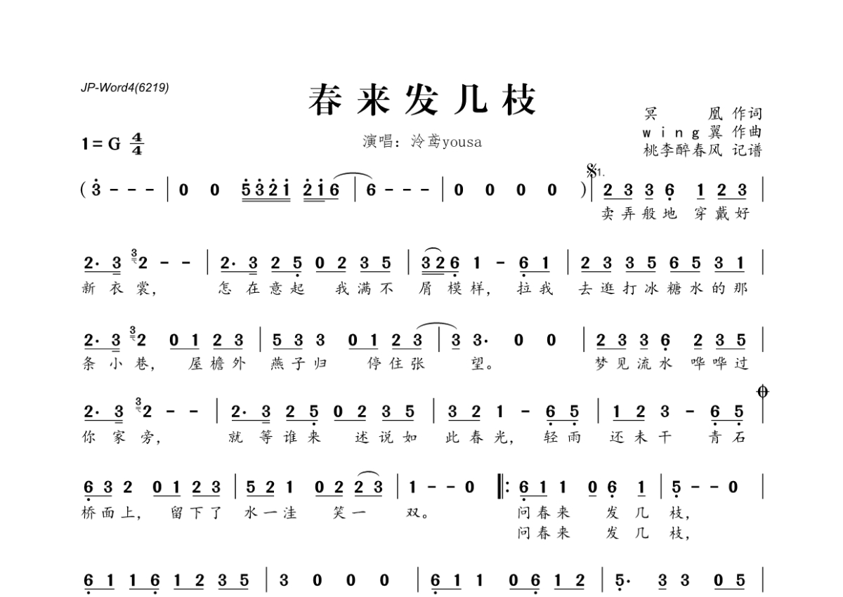 《春来发几枝》是冷鸢演唱的一首歌曲,拍号为4/4拍,这份简谱共有两张高清图谱,图谱由 @桃李醉春风 编配上传。