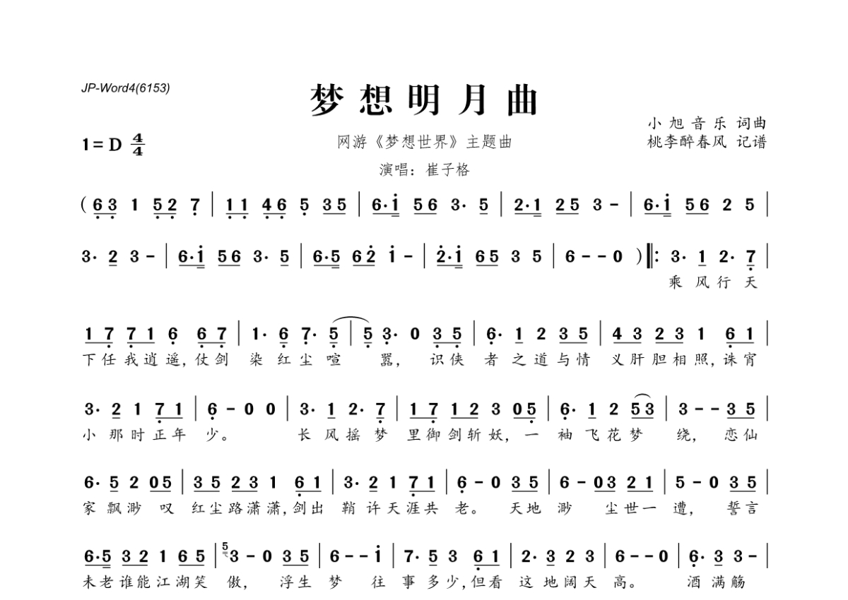 《梦想明月曲》是崔子格演唱的一首歌曲,拍号为4/4拍,这份简谱共有一张高清图谱,图谱由 @桃李醉春风 编配上传。