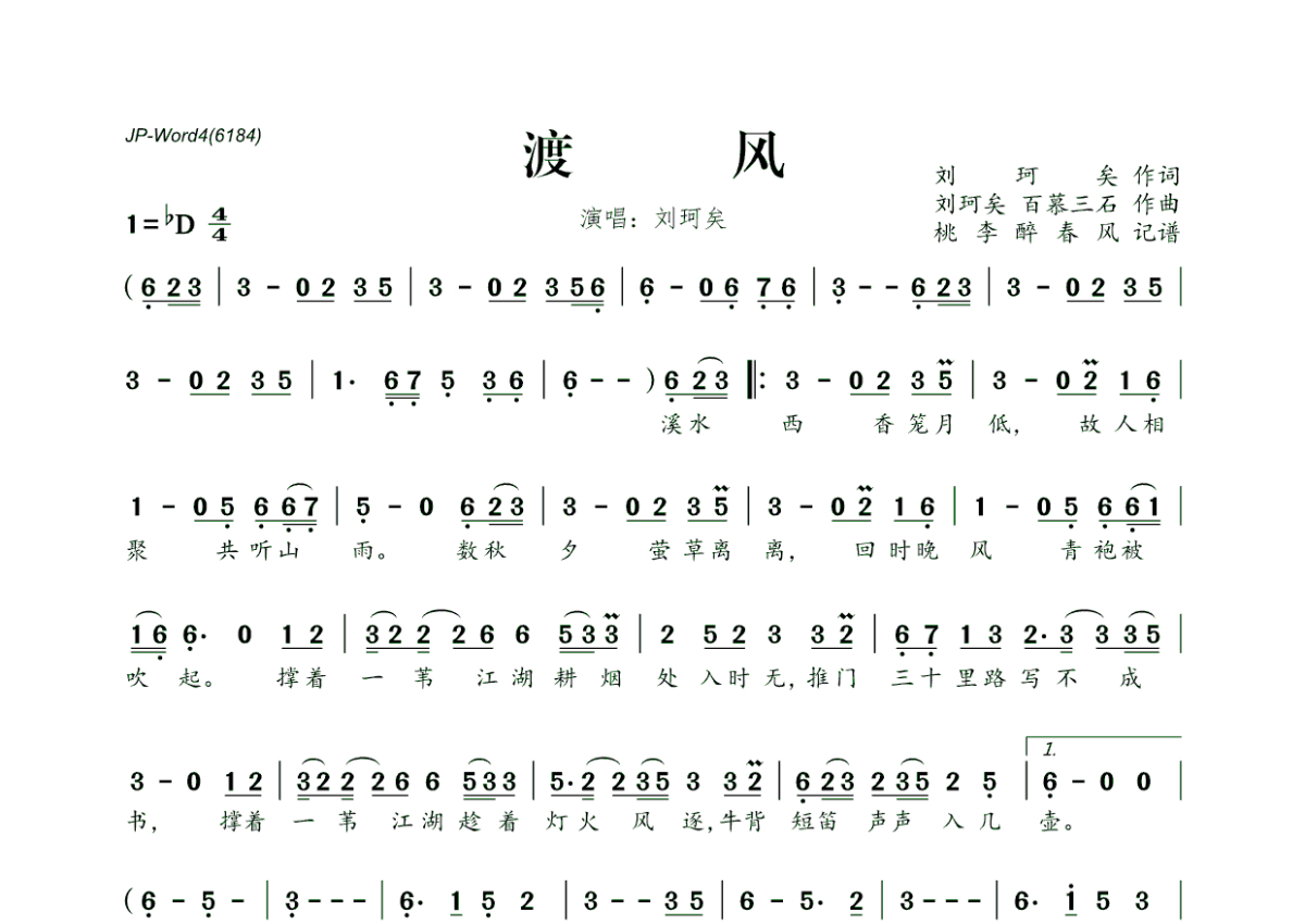 《渡风》是刘珂矣演唱的一首歌曲,拍号为4/4拍,这份简谱共有一张高清图谱,图谱由 @桃李醉春风 编配上传。