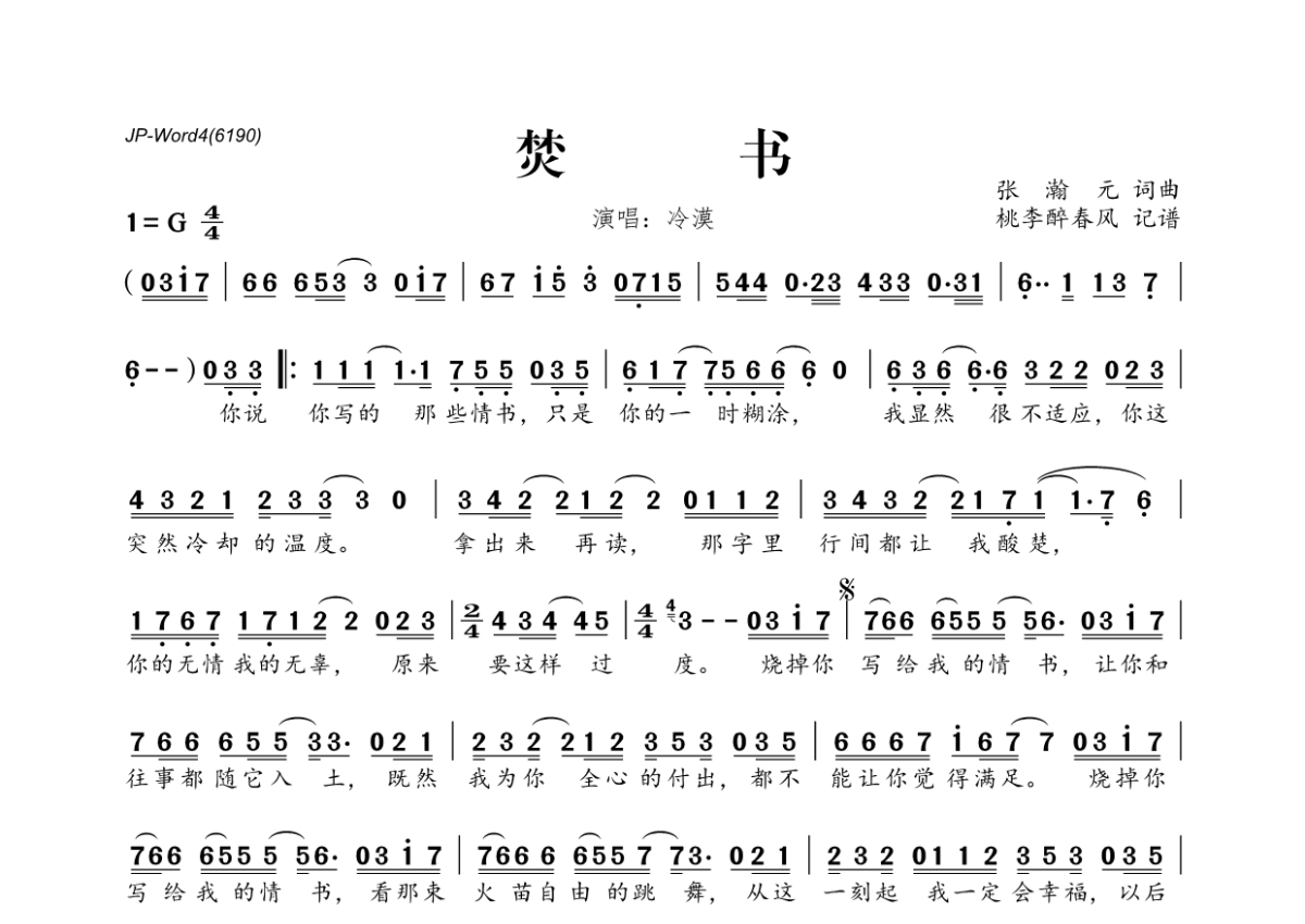 《焚书》是冷漠演唱的一首歌曲,拍号为4/4拍,这份简谱共有一张高清图谱,图谱由 @桃李醉春风 编配上传。