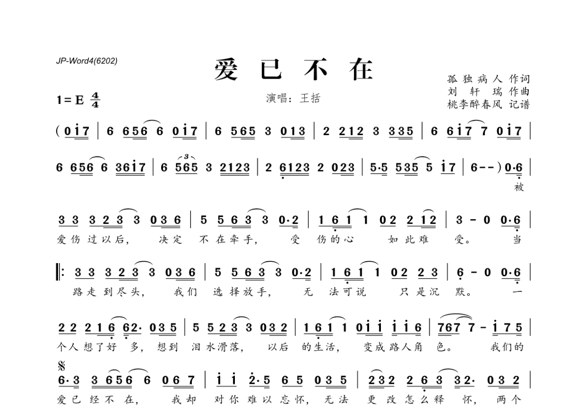 《爱已不在》是王括演唱的一首歌曲,拍号为4/4拍,这份简谱共有一张高清图谱,图谱由 @桃李醉春风 编配上传。