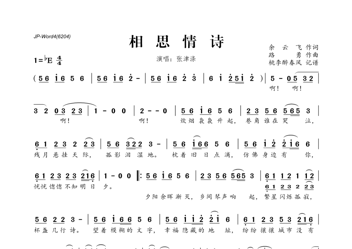 《相思情诗》是张津涤演唱的一首歌曲,拍号为4/4拍,这份简谱共有一张高清图谱,图谱由 @桃李醉春风 编配上传。