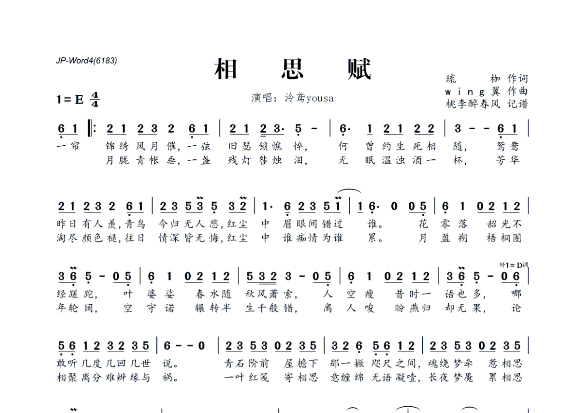 《相思赋》是泠鸢yousa演唱的一首歌曲,拍号为4/4拍,这份简谱共有一张高清图谱,图谱由 @桃李醉春风 编配上传。