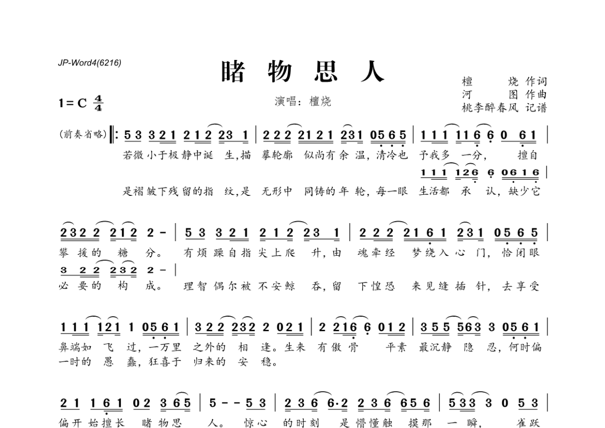 《睹物思人》是檀烧演唱的一首歌曲,拍号为4/4拍,这份简谱共有一张高清图谱,图谱由 @桃李醉春风 编配上传。