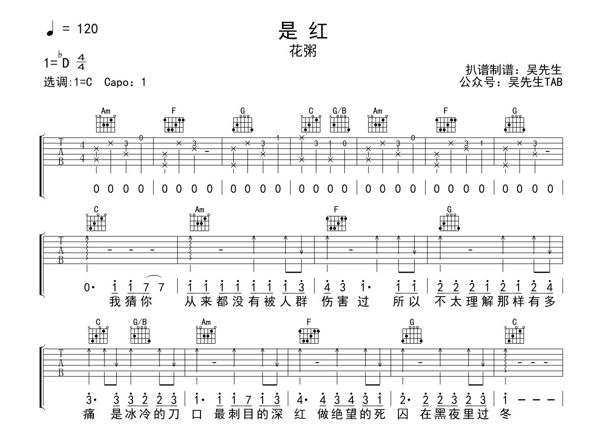《是红》是花粥演唱的一首歌曲,本吉他谱采用的是C调指法编配,这份吉他谱共有两张高清图谱,图谱由 @吴先生TAB 编配上传,图谱使用六线谱编配,包含吉他和弦指法、简谱以及歌词部分,使用这份是红吉他谱,可以让你更加方便地掌握这首歌曲的弹唱技巧,快来尝试吧。