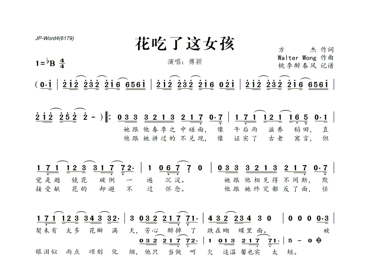 《花吃了这女孩》是傅颖演唱的一首歌曲,拍号为4/4拍,这份简谱共有两张高清图谱,图谱由 @桃李醉春风 编配上传。