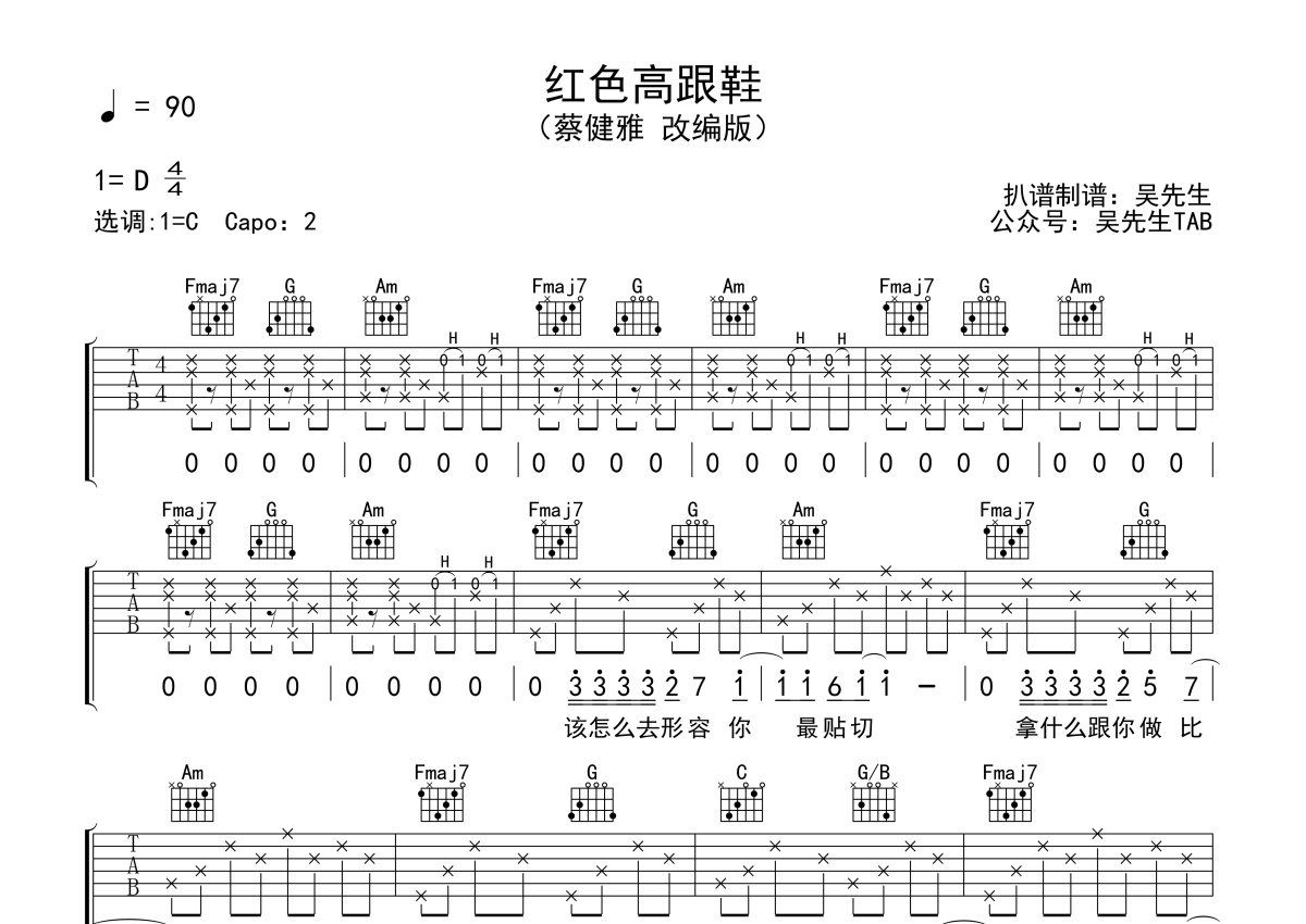 《红色高跟鞋》是蔡健雅演唱的一首歌曲,蔡健雅改编版,本吉他谱采用的是C调指法编配,这份吉他谱共有两张高清图谱,图谱由 @吴先生TAB 编配上传,图谱使用六线谱编配,包含吉他和弦指法、简谱以及歌词部分,使用这份红色高跟鞋吉他谱,可以让你更加方便地掌握这首歌曲的弹唱技巧,快来尝试吧。《红色高跟鞋》是蔡健雅演唱的一首歌曲,由蔡健雅作词、作曲,这首歌曲是2008年上映的贺岁电影《爱情呼叫转移2》的主题曲,之后收录在蔡健雅2009年8月发行的专辑《若你碰到他》中。蔡健雅表示写《红色高跟鞋》是2007年的事情。她发现自己特别爱红色高跟鞋还有很多高跟鞋,每次去逛街第一个去看的就是高跟鞋,就想写一首歌表达自己跟高跟鞋的一种暧昧。于是就创作了《红色高跟鞋》这首歌曲。《红色高跟鞋》这首歌曲对都市男女爱情观的透彻解读,令人过耳难忘。身为音乐创作人、制作人以及演唱者的蔡健雅,把整首歌的音线弧度表现得相当得舒服自在,都市女性的独立自主,知性自信也在她慵懒温暖的声线中有了最鲜活的展示。《红色高跟鞋》从歌词的“爱你有种左灯右行的冲突”能看出这是一首命题作文式的歌曲,而蔡健雅略带沙哑的独特嗓音,也唱出了女性对爱情的追逐,疯狂却没有退路,就像红色高跟鞋,性感而又热烈。