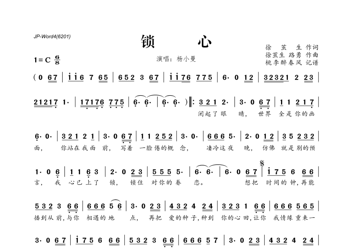 《锁心》是杨小曼演唱的一首歌曲,拍号为6/8拍,这份简谱共有一张高清图谱,图谱由 @桃李醉春风 编配上传。