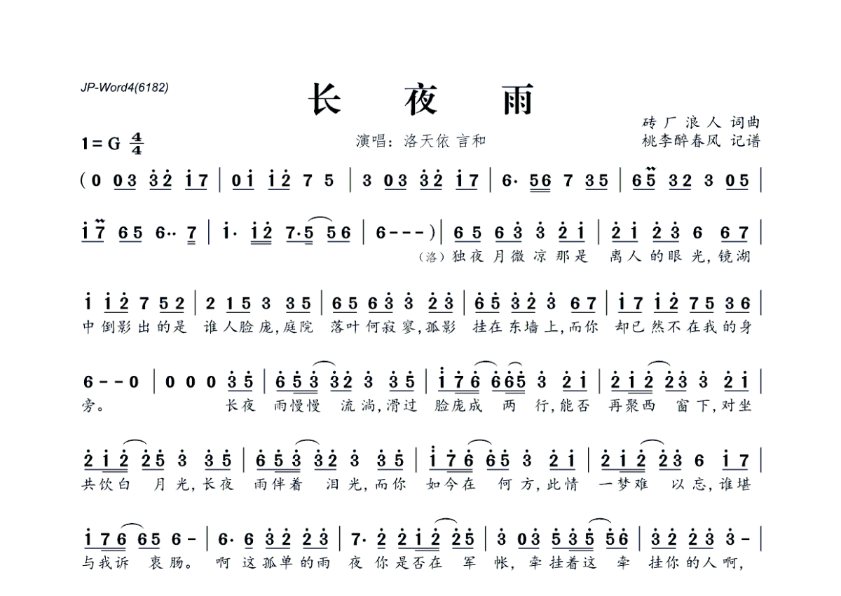 《长夜雨》是洛天依&言和演唱的一首歌曲,拍号为4/4拍,这份简谱共有两张高清图谱,图谱由 @桃李醉春风 编配上传。
