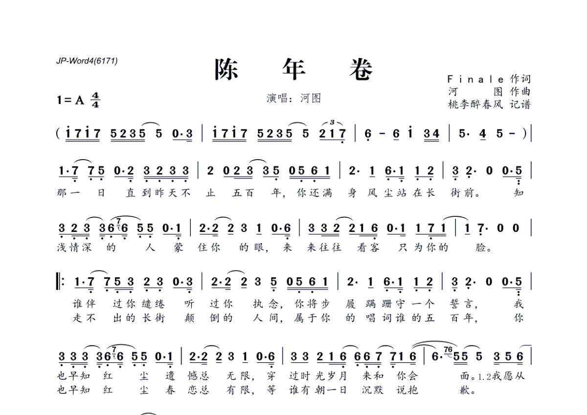 《陈年卷》是河图演唱的一首歌曲,拍号为4/4拍,这份简谱共有一张高清图谱,图谱由 @桃李醉春风 编配上传。