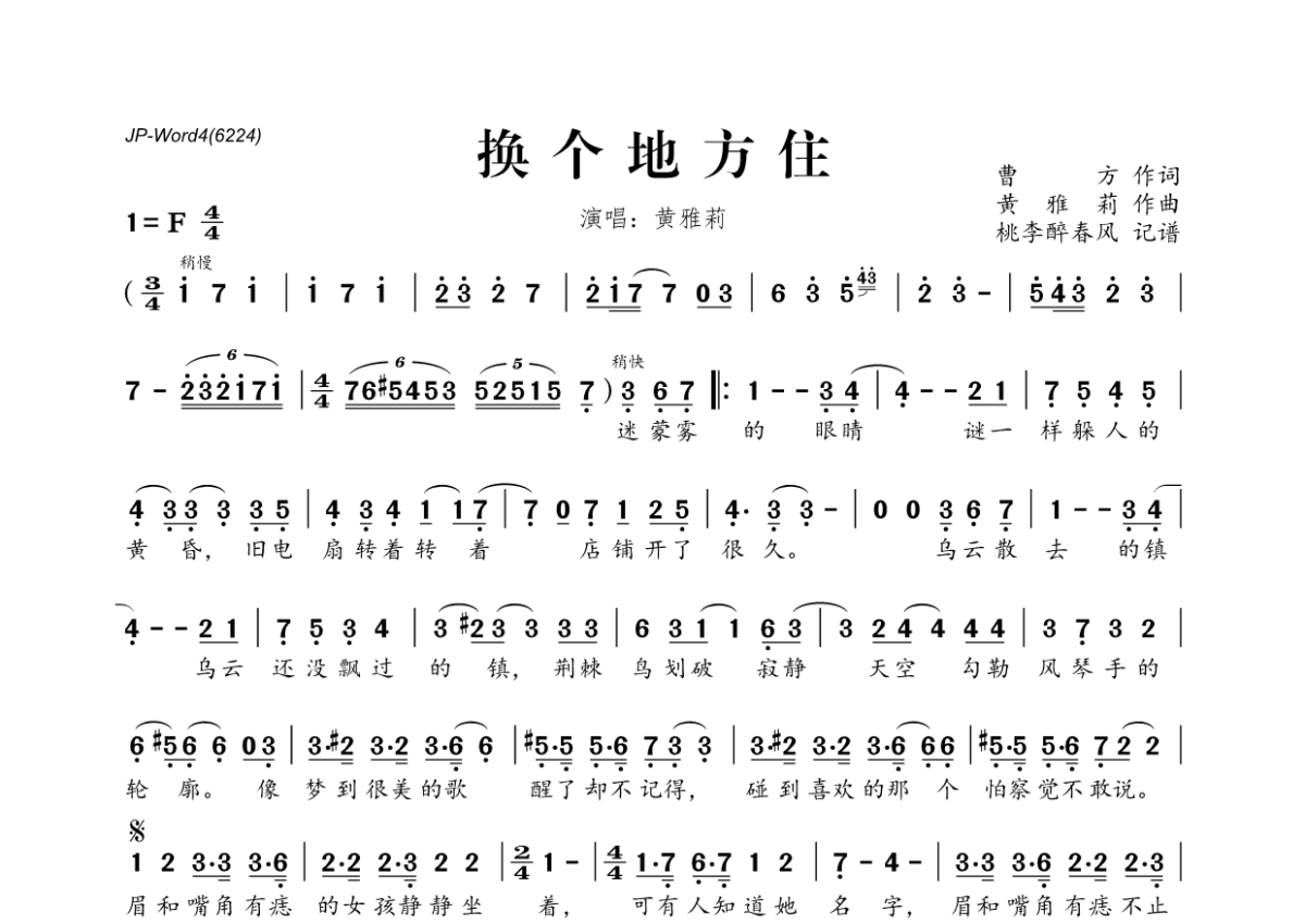 《换个地方住》是黄雅莉演唱的一首歌曲,拍号为4/4拍,这份简谱共有一张高清图谱,图谱由 @桃李醉春风 编配上传。