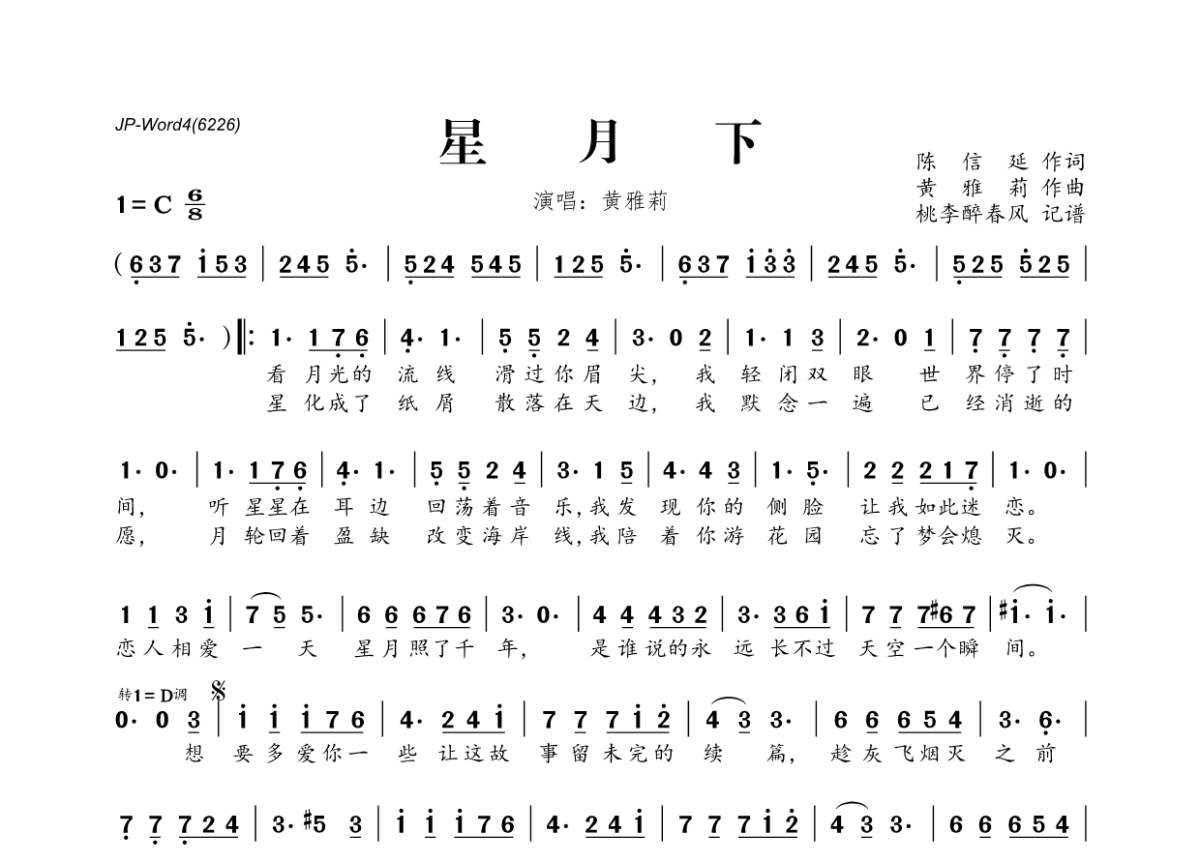 星月下简谱 - 黄雅莉演唱