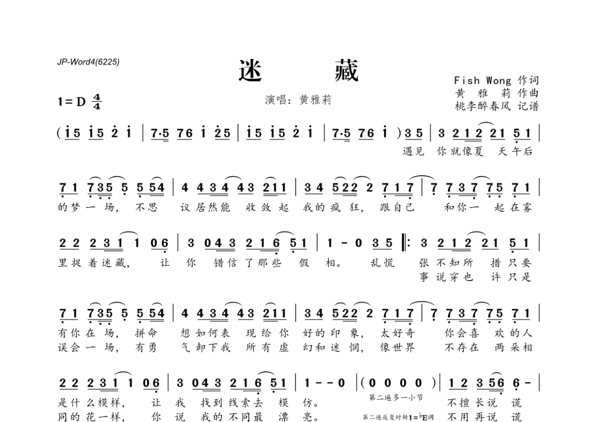 《迷藏》是黄雅莉演唱的一首歌曲,拍号为4/4拍,这份简谱共有一张高清图谱,图谱由 @桃李醉春风 编配上传。