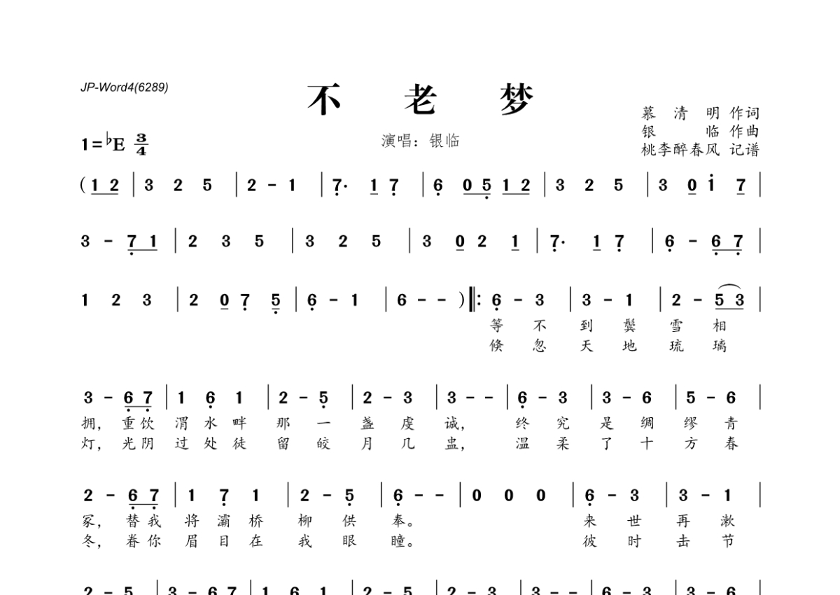 《不老梦》是银临演唱的一首歌曲,拍号为3/4拍,这份简谱共有两张高清图谱,图谱由 @桃李醉春风 编配上传。