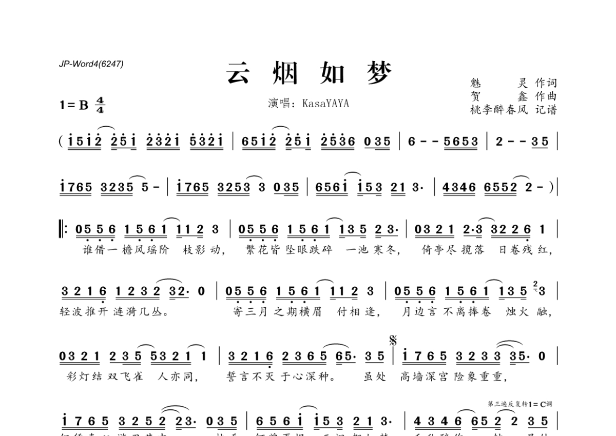 kasayaya《云烟如梦》简谱