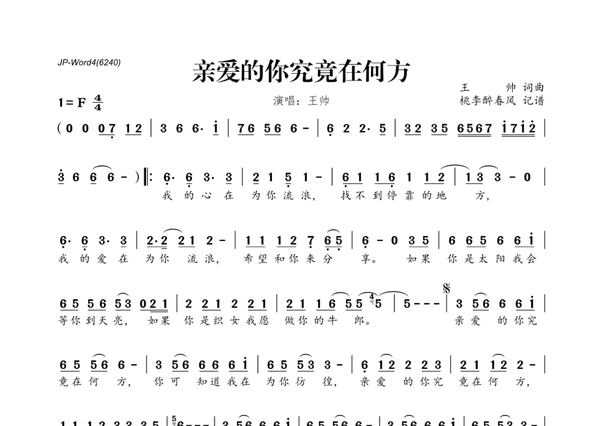 《亲爱的你究竟在何方》是王帅演唱的一首歌曲,拍号为4/4拍,这份简谱共有一张高清图谱,图谱由 @桃李醉春风 编配上传。