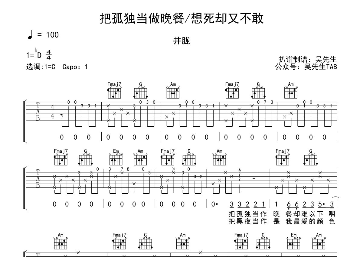 《把孤独当做晚餐》是井胧演唱的一首歌曲,本吉他谱采用的是C调指法编配,这份吉他谱共有两张高清图谱,图谱由 @吴先生TAB 编配上传,图谱使用六线谱编配,包含吉他和弦指法、简谱以及歌词部分,使用这份把孤独当做晚餐吉他谱,可以让你更加方便地掌握这首歌曲的弹唱技巧,快来尝试吧。流行于抖音平台的《把孤独当做晚餐》,和另外一首歌《想死却又不敢》和弦走向完全一样,仅仅歌词部分不同,所以作者把这两首歌的谱子合在一起,歌词分上下两行。