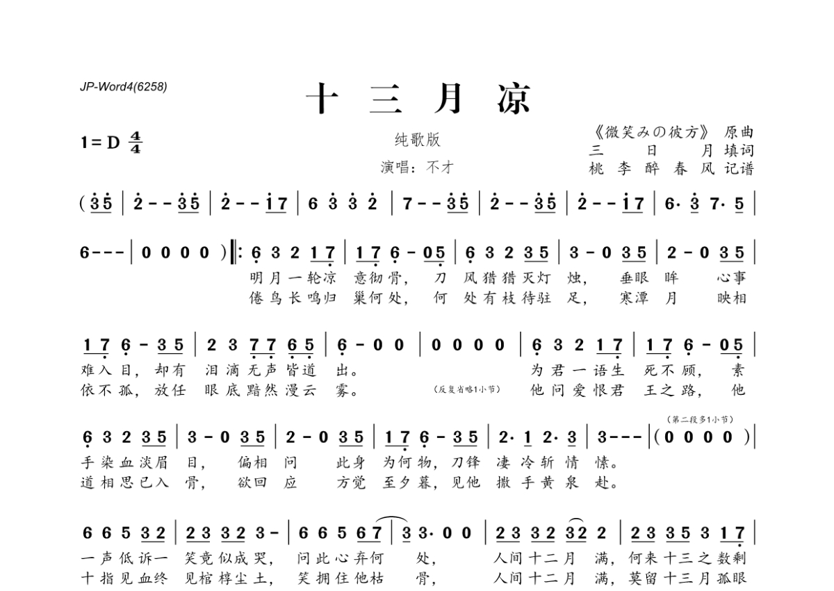 《十三月凉》是不才演唱的一首歌曲,拍号为4/4拍,这份简谱共有一张高清图谱,图谱由 @桃李醉春风 编配上传。