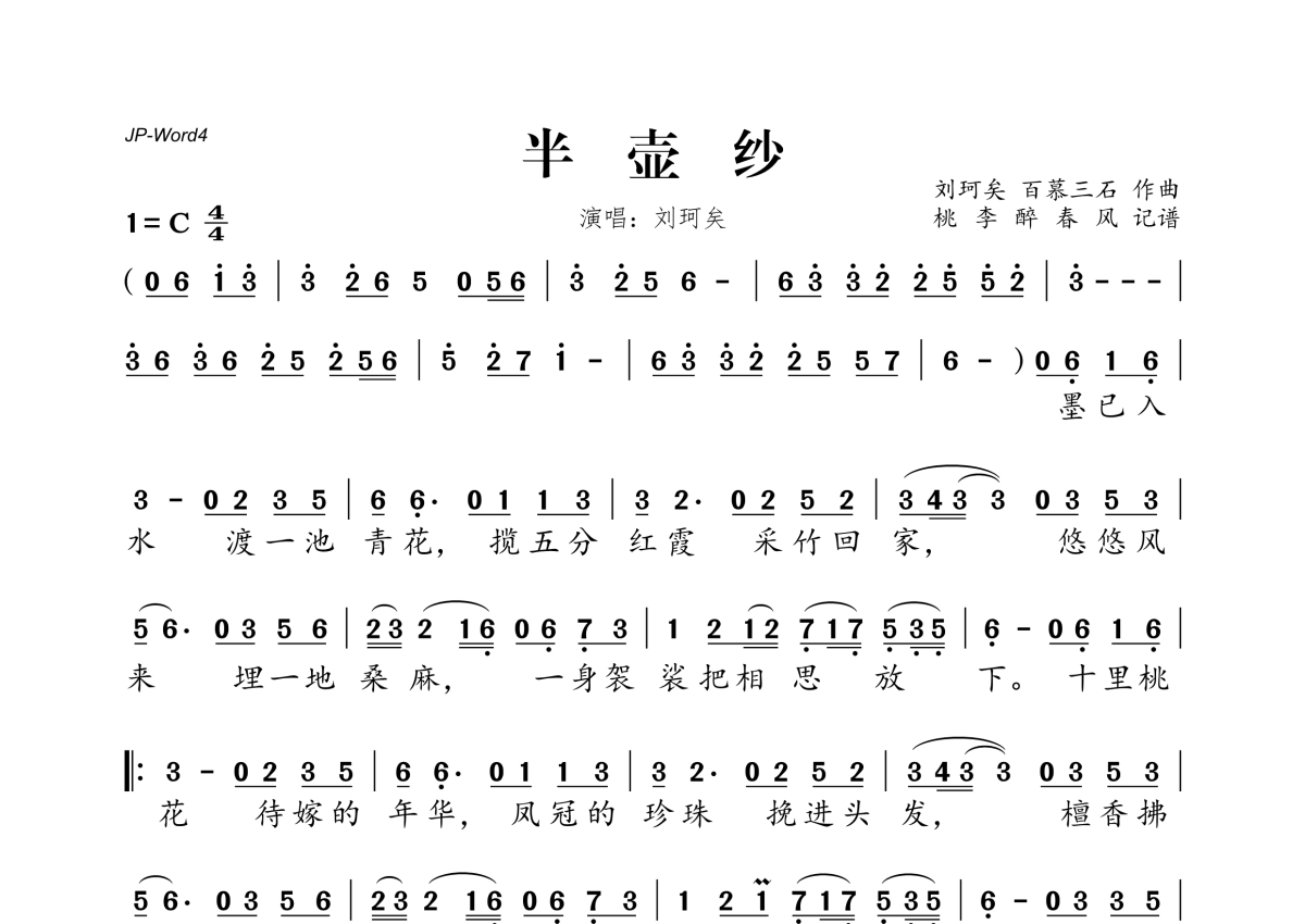 《半壶纱》是刘珂矣演唱的一首歌曲,拍号为4/4拍,这份简谱共有一张高清图谱,图谱由 @桃李醉春风 编配上传。