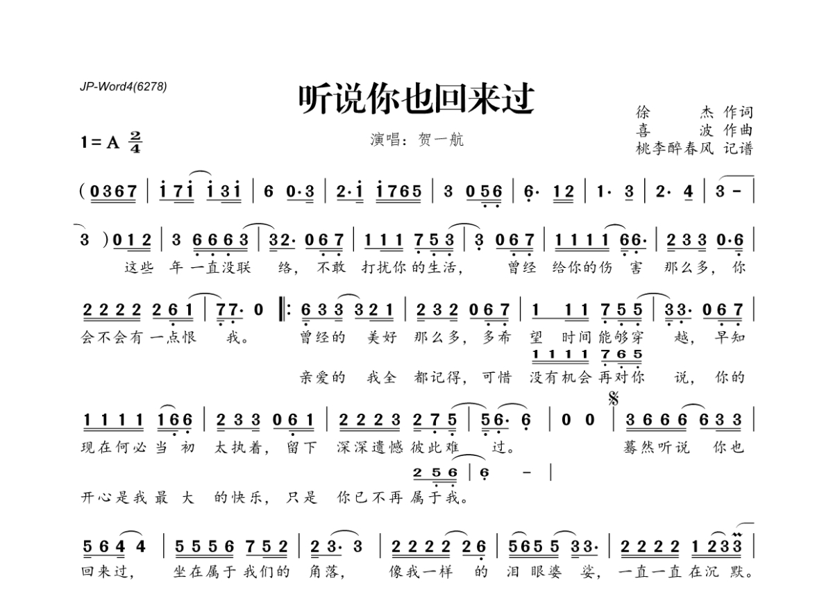 《听说你也回来过》是贺一航演唱的一首歌曲,拍号为2/4拍,这份简谱共有一张高清图谱,图谱由 @桃李醉春风 编配上传。