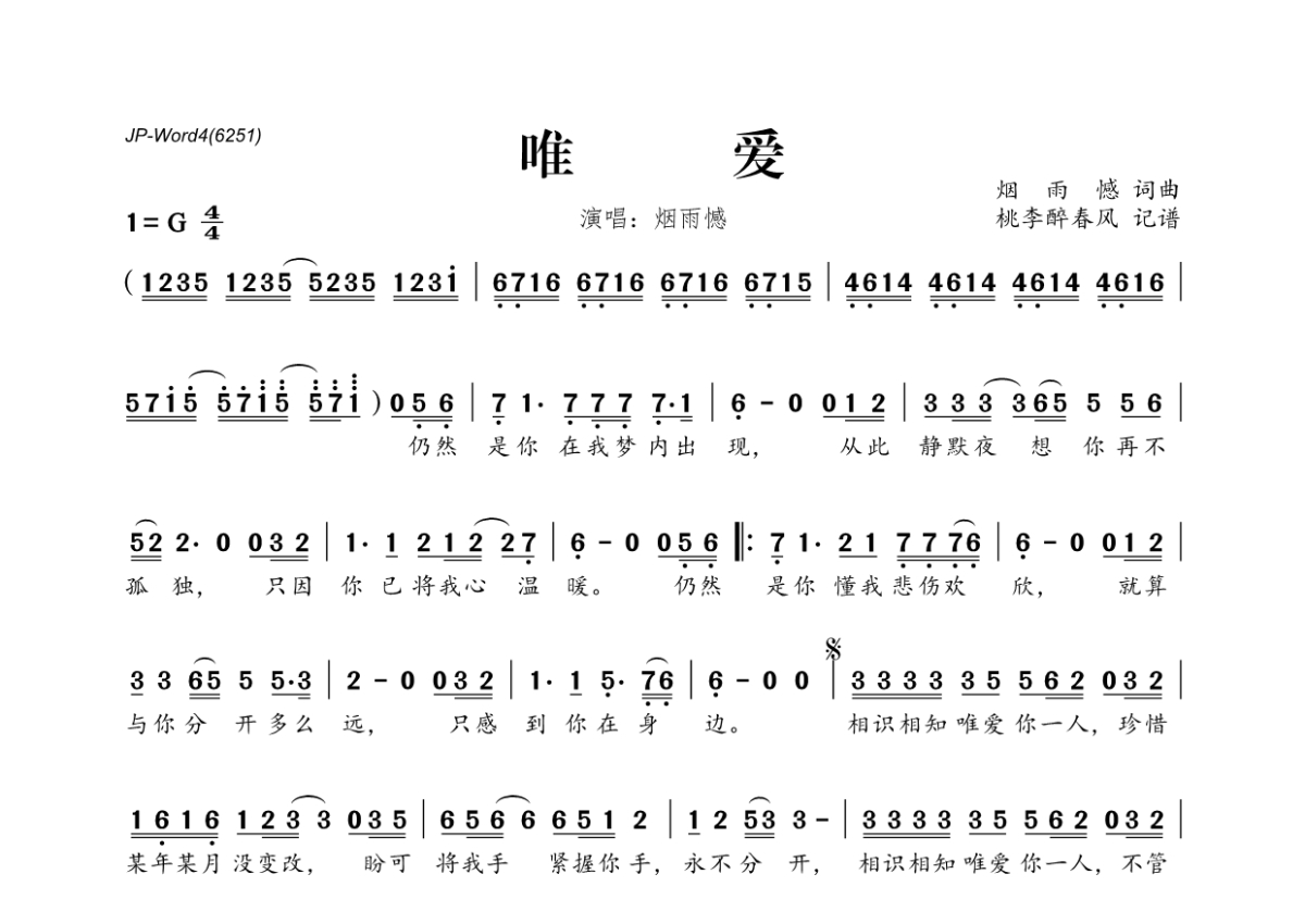 《唯爱》是烟雨憾演唱的一首歌曲,拍号为4/4拍,这份简谱共有一张高清图谱,图谱由 @桃李醉春风 编配上传。