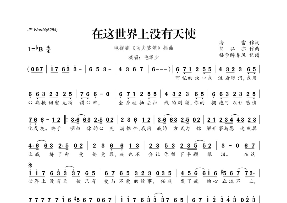 毛泽少《在这世界上没有天使》简谱