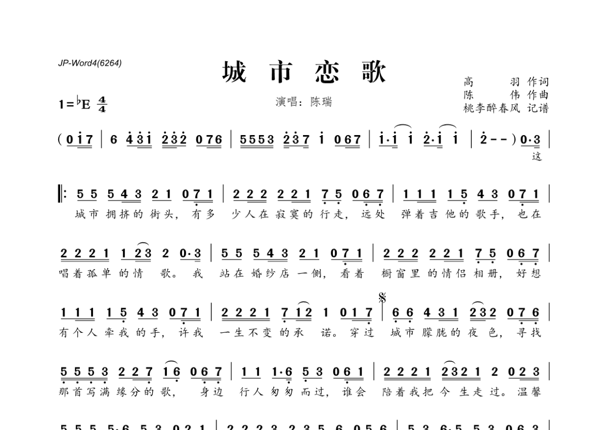 《城市恋歌》是陈瑞演唱的一首歌曲,拍号为4/4拍,这份简谱共有一张高清图谱,图谱由 @桃李醉春风 编配上传。