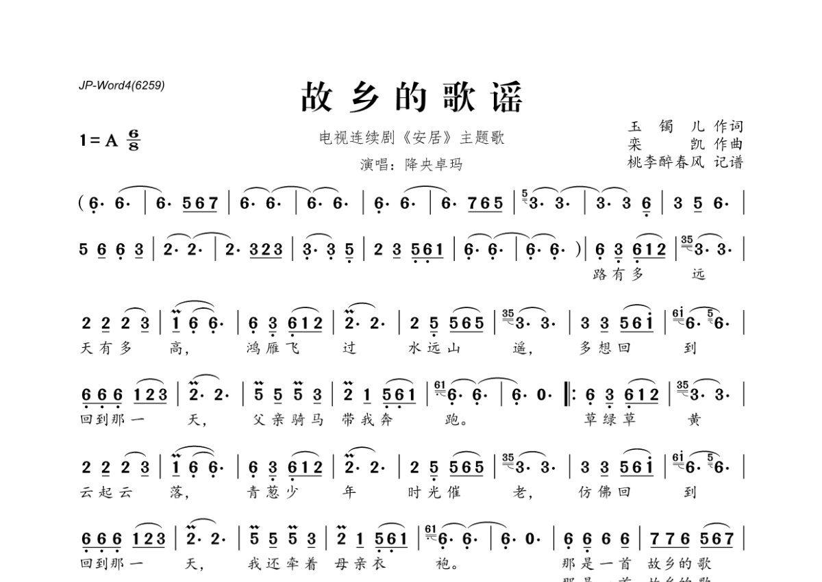 《故乡的歌谣》是降央卓玛演唱的一首歌曲,拍号为6/8拍,这份简谱共有一张高清图谱,图谱由 @桃李醉春风 编配上传。