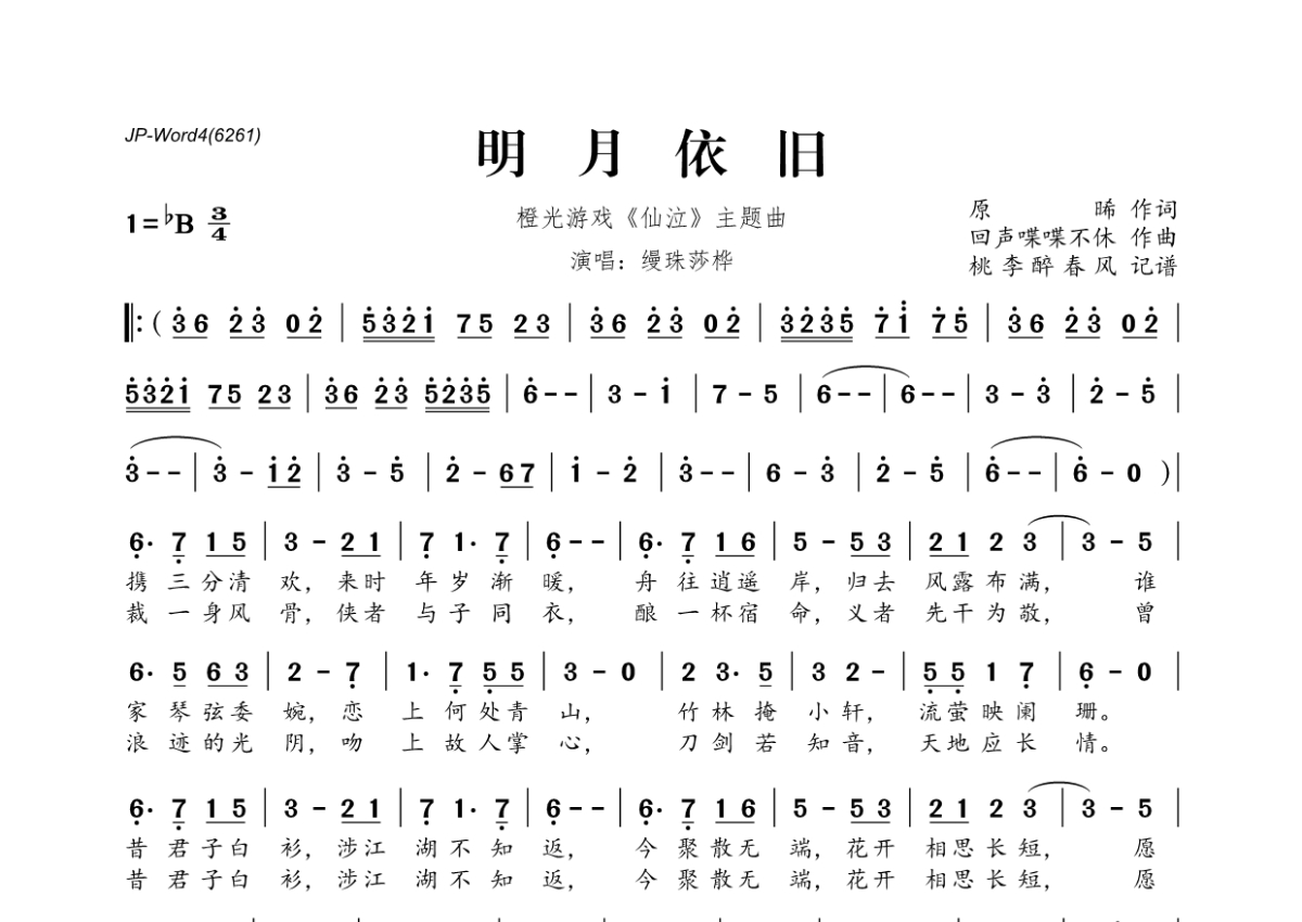 《明月依旧》是缦珠莎桦演唱的一首歌曲,拍号为3/4拍,这份简谱共有一张高清图谱,图谱由 @桃李醉春风 编配上传。