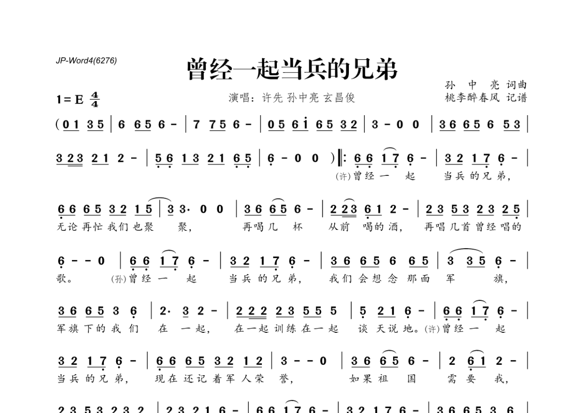 孙中亮&许先&玄昌俊 music《曾经一起当兵的兄弟》简谱