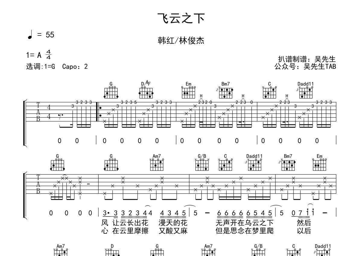 《飞云之下》是韩红\林俊杰演唱的一首歌曲,本吉他谱采用的是G调指法编配,这份吉他谱共有两张高清图谱,图谱由 @吴先生TAB 编配上传,图谱使用六线谱编配,包含吉他和弦指法、简谱以及歌词部分,使用这份飞云之下吉他谱,可以让你更加方便地掌握这首歌曲的弹唱技巧,快来尝试吧。原调A调,选G调指法,变调夹夹2品回原调。前奏、间奏和尾奏都是按照作者个人喜好进行改编的,并没有按照原曲编配,所以或许并不适合追求原版的同学。这首歌最大的难点或许就是男生唱不了林俊杰的key,女生唱不了韩红的key,男生唱不了韩红的key,女生唱不了林俊杰的key。