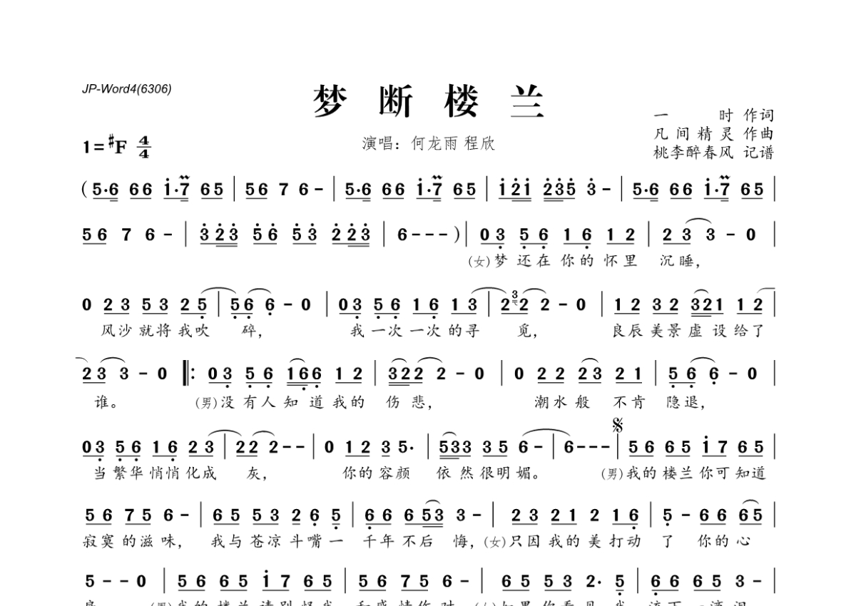 《梦断楼兰》是何龙雨&程欣演唱的一首歌曲,拍号为4/4拍,这份简谱共有一张高清图谱,图谱由 @桃李醉春风 编配上传。