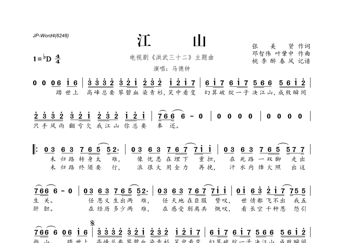 《江山》是马德钟演唱的一首歌曲,拍号为4/4拍,这份简谱共有一张高清图谱,图谱由 @桃李醉春风 编配上传。