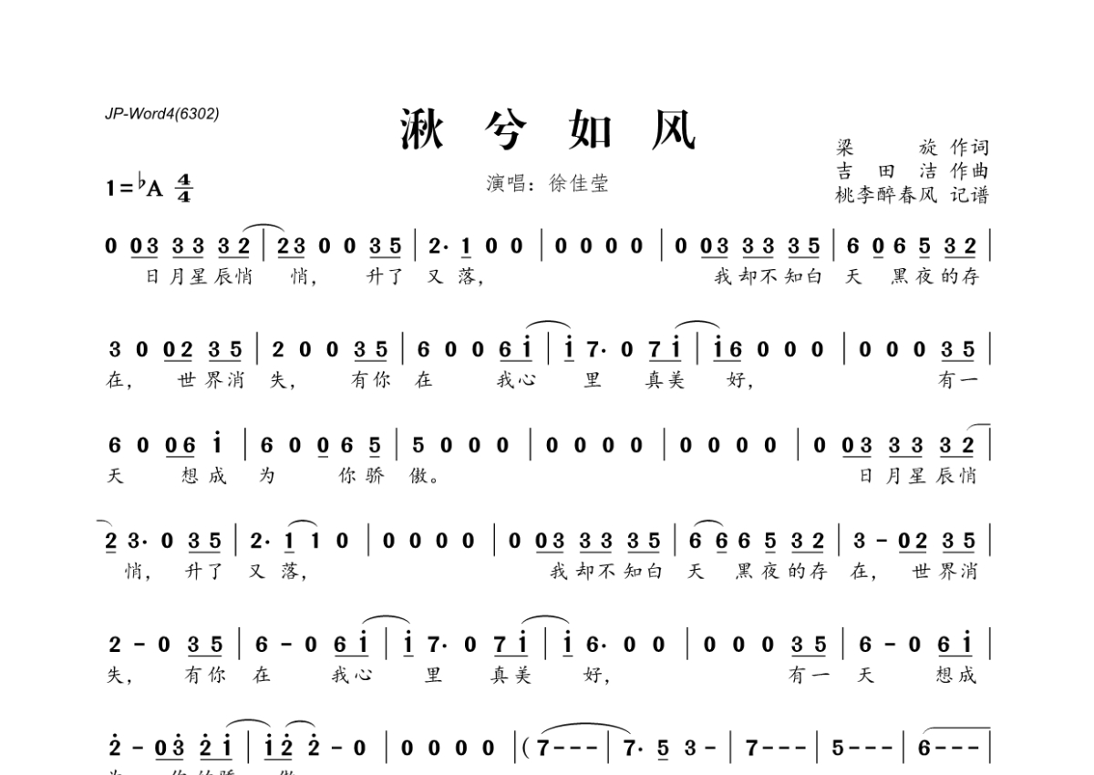 《湫兮如风》是徐佳莹演唱的一首歌曲,拍号为4/4拍,这份简谱共有一张高清图谱,图谱由 @桃李醉春风 编配上传。