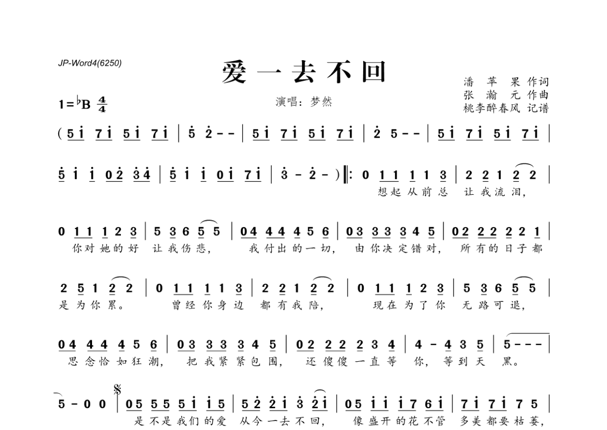 《爱一去不回》是梦然演唱的一首歌曲,拍号为4/4拍,这份简谱共有一张高清图谱,图谱由 @桃李醉春风 编配上传。