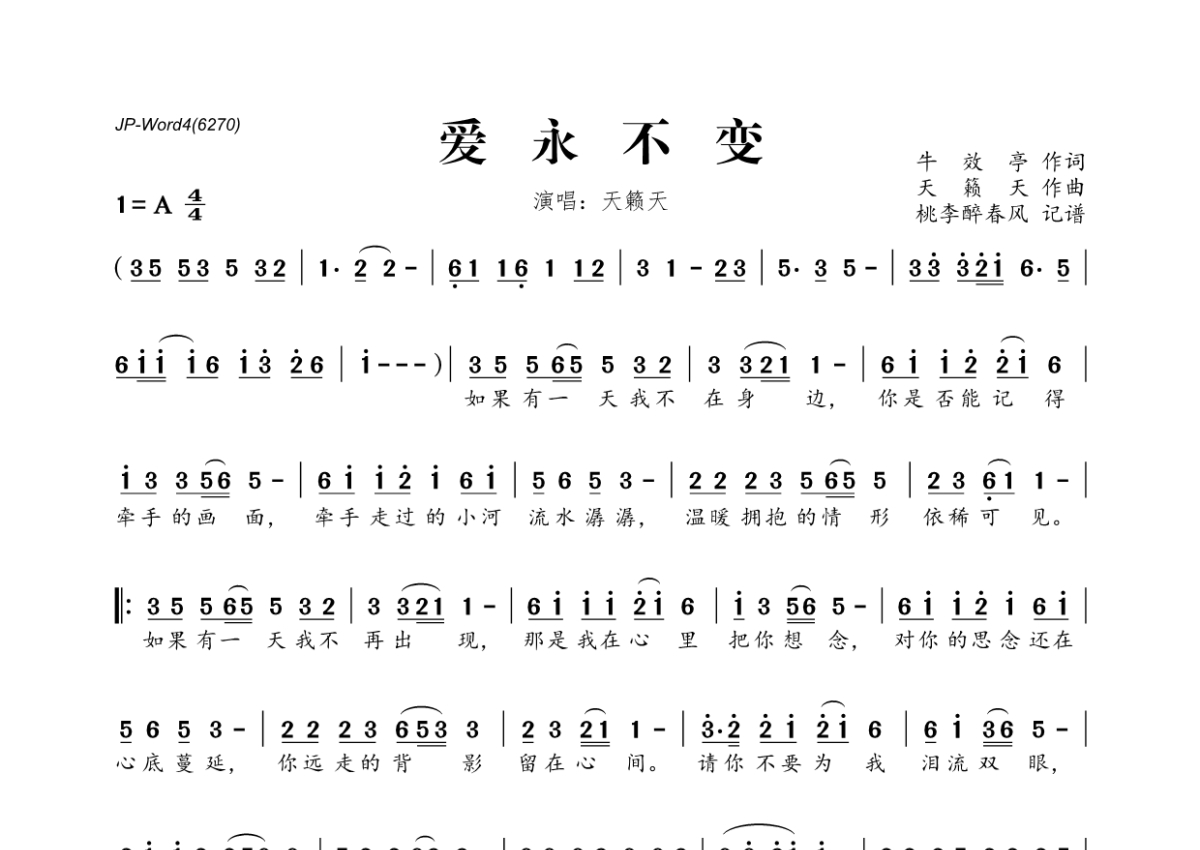 《爱永不变》是天籁天演唱的一首歌曲,拍号为4/4拍,这份简谱共有一张高清图谱,图谱由 @桃李醉春风 编配上传。