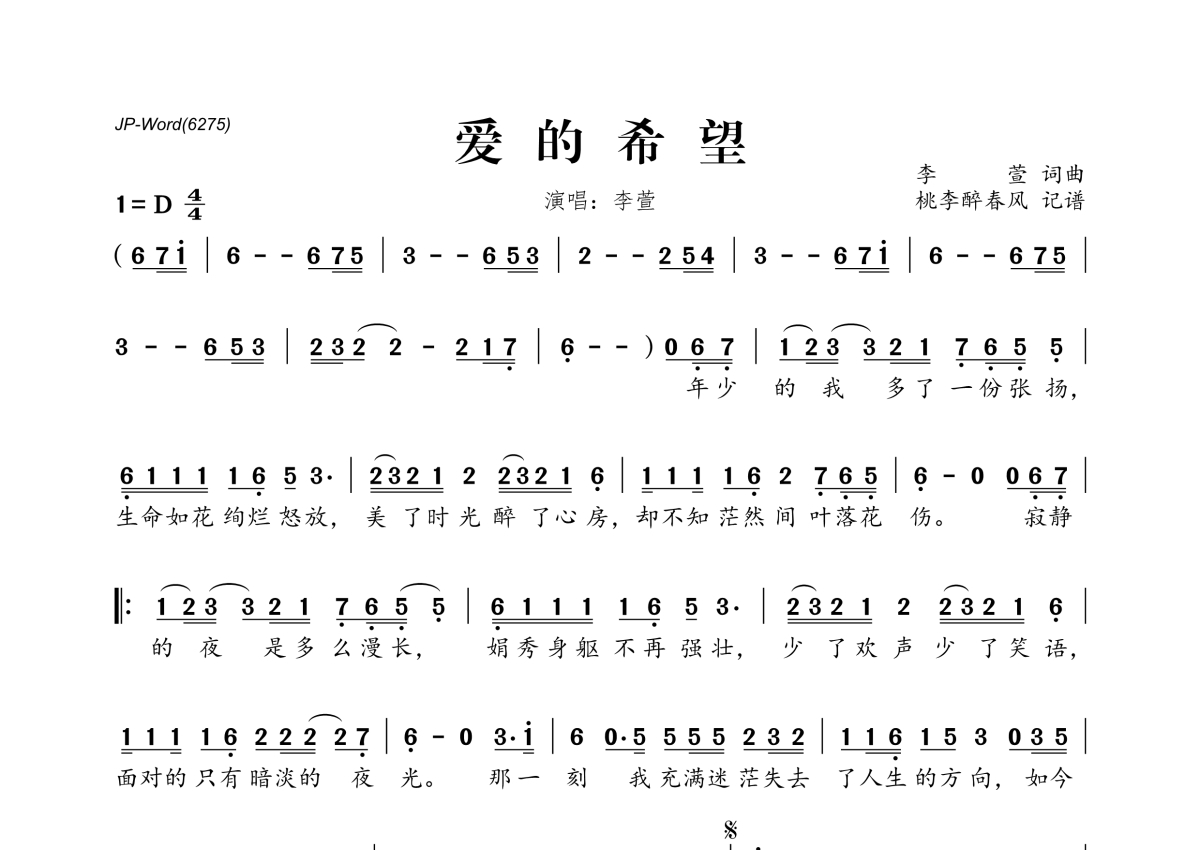 《爱的希望》是李萱演唱的一首歌曲,拍号为4/4拍,这份简谱共有一张高清图谱,图谱由 @桃李醉春风 编配上传。
