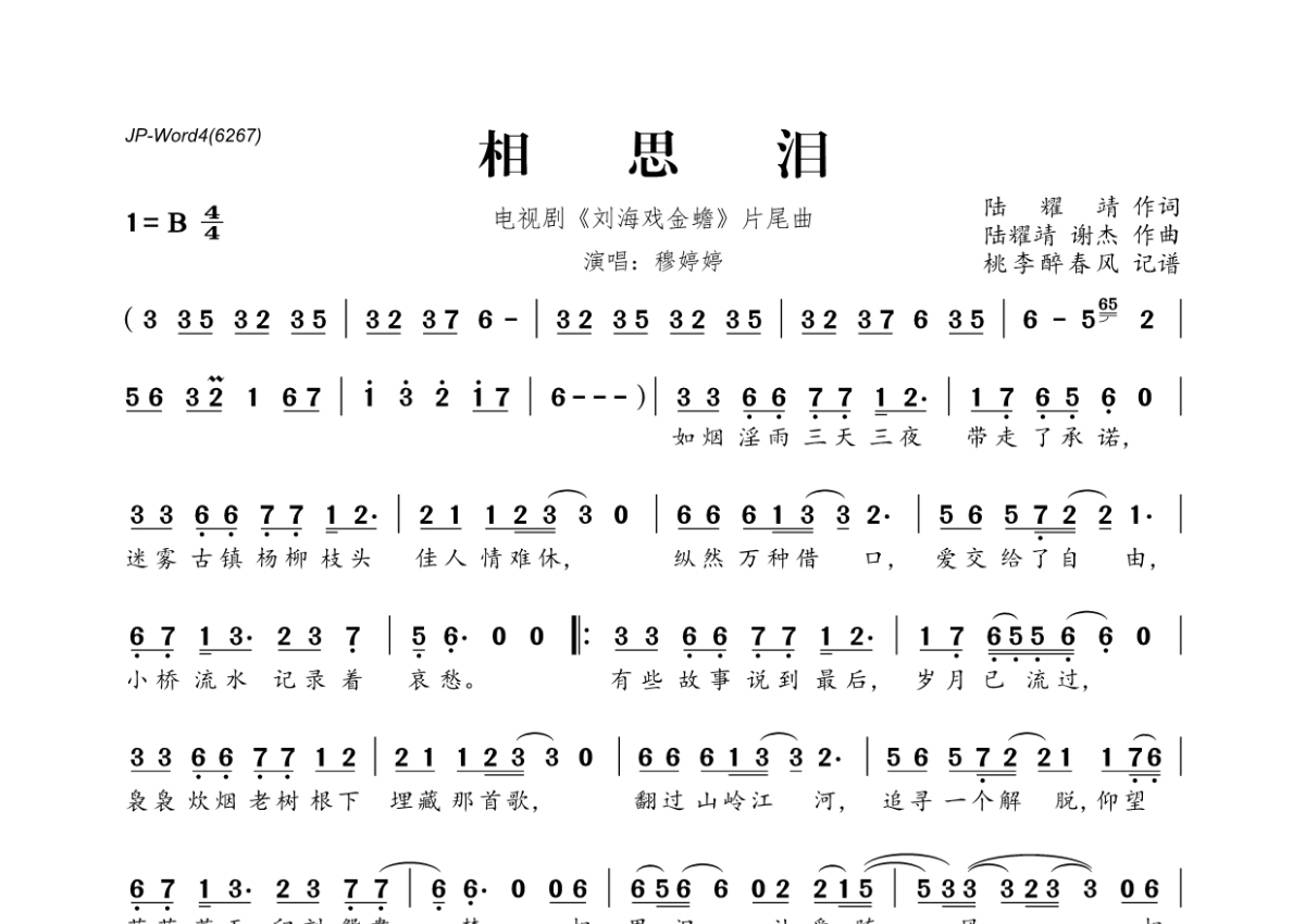 《相思泪》是穆婷婷演唱的一首歌曲,拍号为4/4拍,这份简谱共有一张高清图谱,图谱由 @桃李醉春风 编配上传。