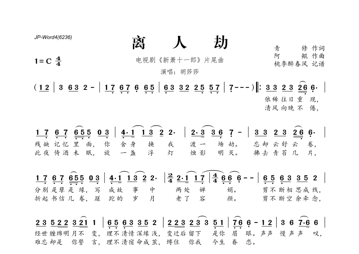 《离人劫》是胡莎莎演唱的一首歌曲,拍号为4/4拍,这份简谱共有一张高清图谱,图谱由 @桃李醉春风 编配上传。
