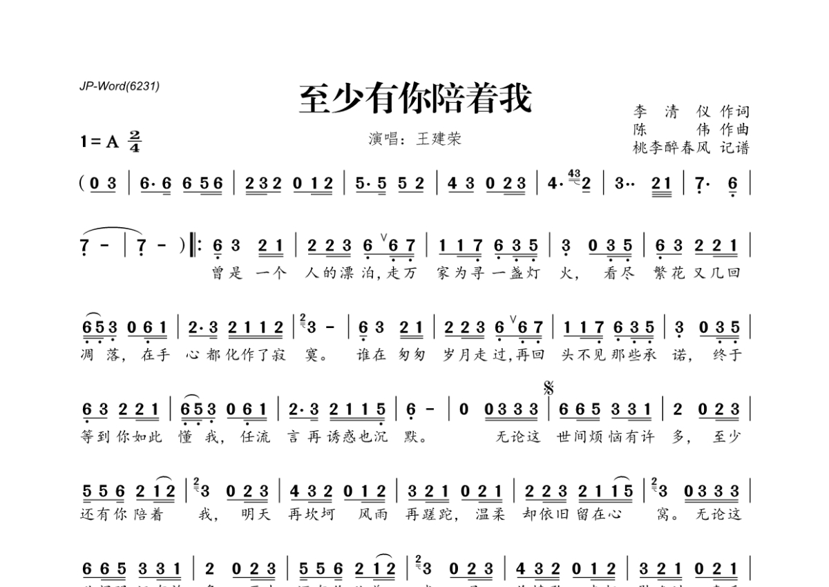《至少有你陪着我》是王建荣演唱的一首歌曲,拍号为2/4拍,这份简谱共有一张高清图谱,图谱由 @桃李醉春风 编配上传。